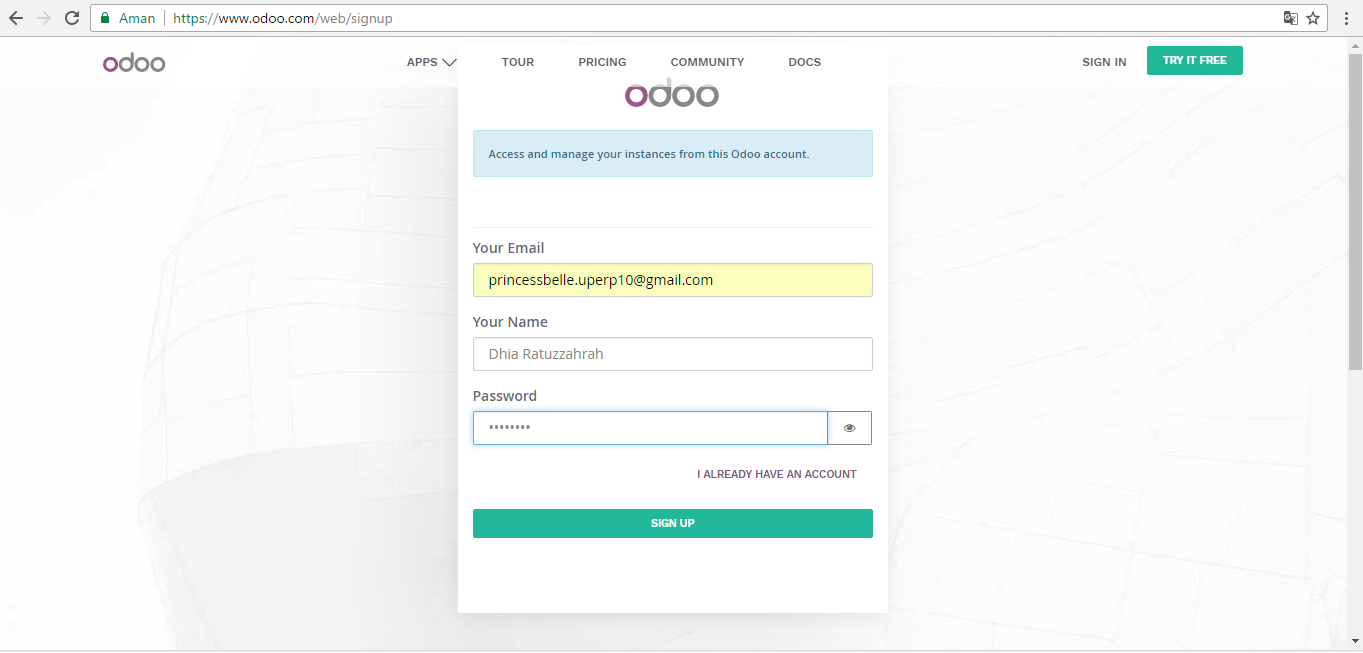 - Akun Odoo pun berhasil dibuat dan siap utntuk digunakan