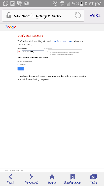 - lalu gmail akan meminta verifikasi nomor hp yg telah didaftarkan tadi, pilih text message lalu klik continue, tunggu sampai kode verifikasi muncul di hp, setelah itu isi kode verifikasinya.