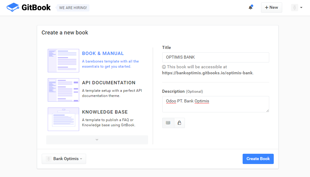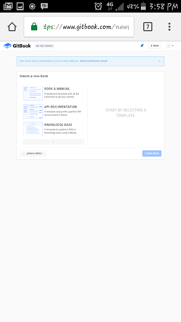 - jadi deh akun Gitbook nya! Sekarang coba-coba pilihan Template Create a new book dengan kategori BOOK & MANUAL