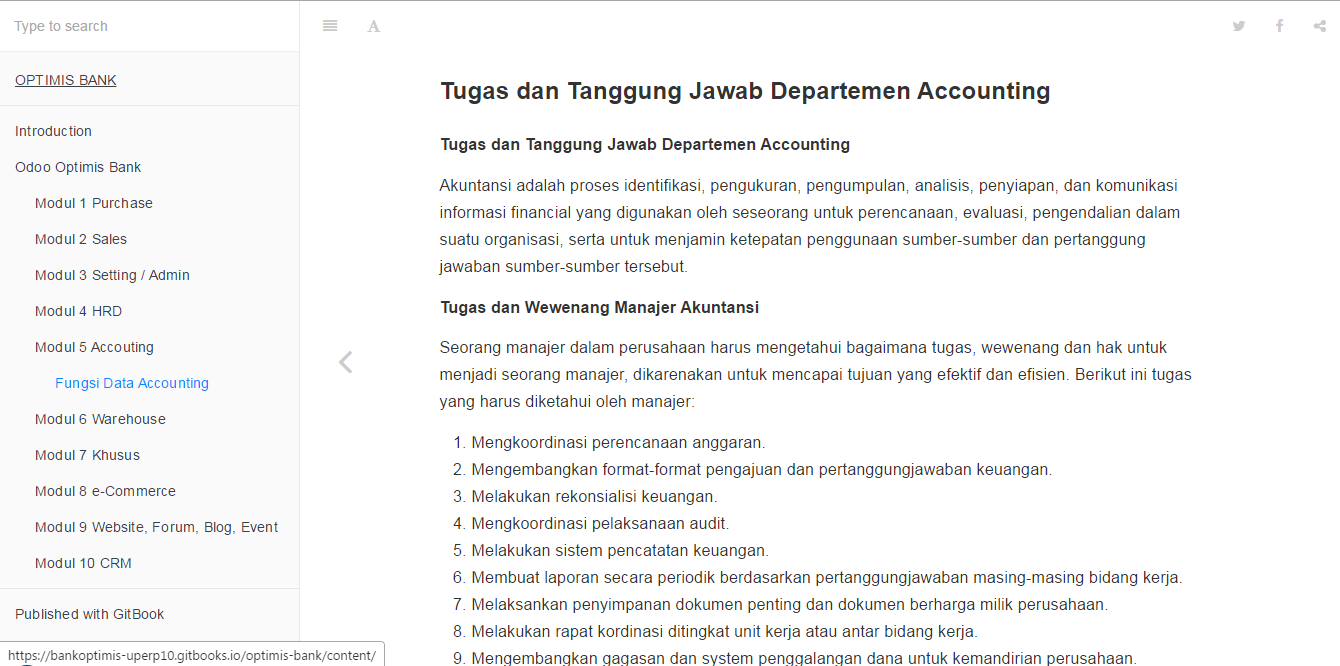 akan ada tampilan seperti ini, disini saya telah menulis e-book tentang modul 5 yakni fungsi modul accounting, jika sudah selesai, klik publish dibagian pojok kanan atas.