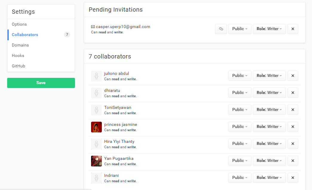 - pilih menu collaborators, lalu isi alamat email anggota yang akan diundang selanjutnya klik save, jika invitation belum diapprove maka diketerangan akan tertulis pending invitation, jika sudah diapprove maka akan muncul dikolom collaborators seperti pada gambar dibawah.