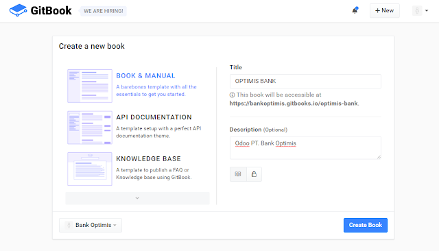 - Disini saya membuat Buku yang berisi Team saya, yang nantinya bernama Optimis bank - Odoo PT Bank Optimis, klik create book