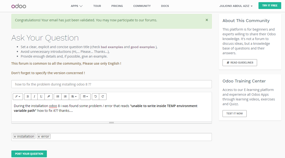 - disini saya mencoba menanyakan perihal kegagalan proses penginstalan odoo 8, isi kolom judul pertanyaan dan isi juga tentang masalah yang ditanyakan, jangan lupa input labelnya juga agar mudah saat proses pencarian. kemudian klik post your question