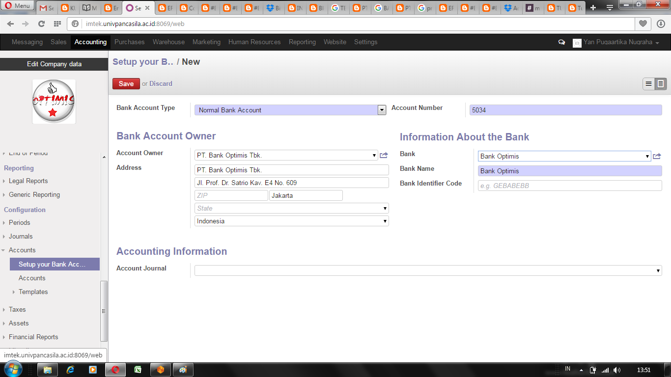 selanjutnya yang akan saya bahas adalah cara menjalankan modul accounting tersebut sesuai dengan sekenario yang telah direncanakan mengenai konfigurasi, invoice, jurnal, chart of account, reporting dan banyak lagi. langsung saja kita
