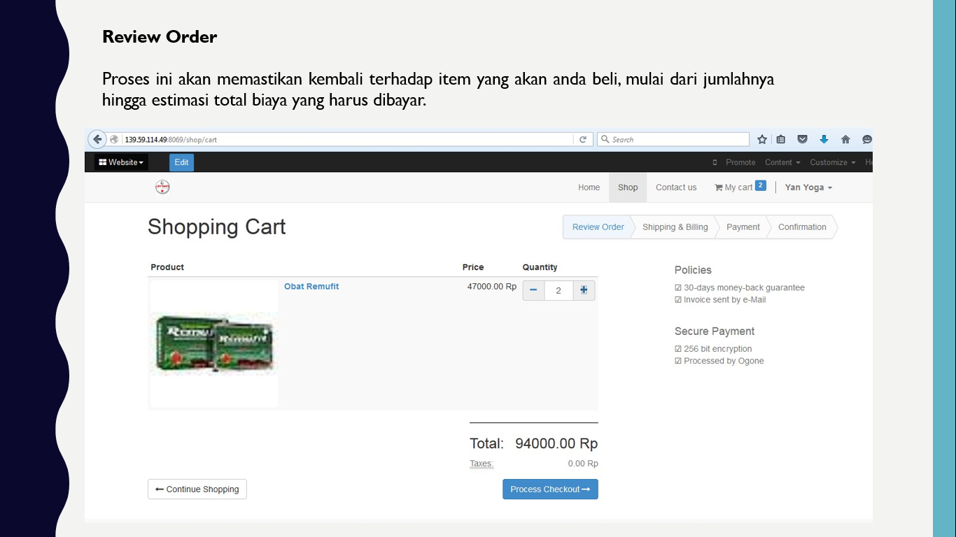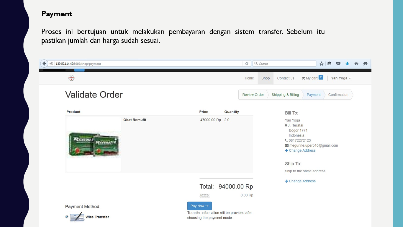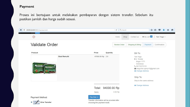 Pada postingan kali ini saya akan menampilkan power point tentang modul e-commerce yang diterapkan pada perusahaan kelompok saya yakni PT. Bank Optimis. Perusahaan ini juga memiliki Rumah Sakit yang menjual beberapa produk seperti : suntikan, alat infus dan obat-obatan. Nah pada kasus ini saya akan menjelaskan e-commerce pada penjualan obat Remufit.
