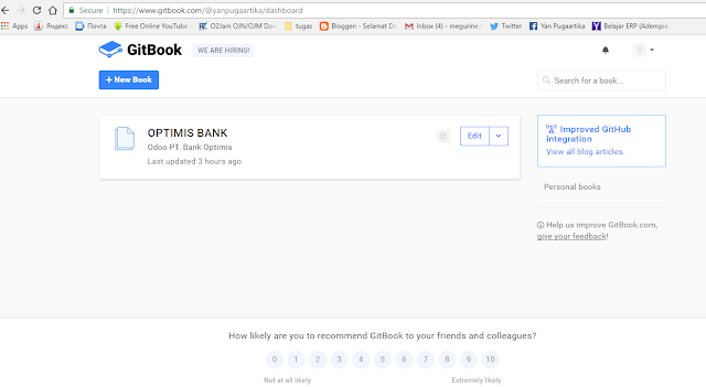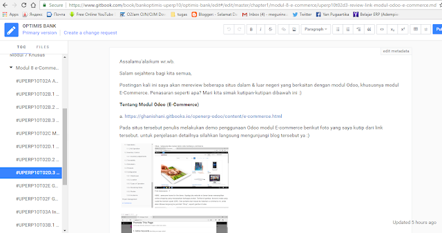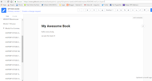 Pada postingan kali ini saya akan menjelaskan tentang UTS ERP selanjutnya mengenai update Gitbook kelompok Bank Optimis -> Gitbook Bank Optimis Saya mengupdate tugas-tugas selama belajar ERP hingga UTS saya pada Gitbook kelompok tersebut. Berikut beberapa screen shoot updatean dari saya pada gitbook kelompok kami.