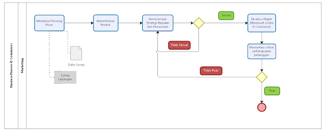 - Bisnis proses untuk ecommerce pada Bank Optimis diawali dengan pihak marketing yang akan membaca peluang pasar dengan cara survey lapangan. Hal tersebut dilakukan untuk mengetahui potensi yang ada.